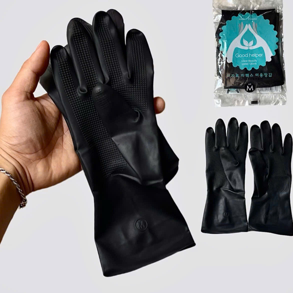 Bao Tay Cao Su Đen 1 Cặp Good Helper : Găng tay cao su Mizar Beauty Latex Glove là loại găng tay chuyên dụng được thiết kế cho các công việc trong ngành làm đẹp và các tác vụ khác, giúp bảo vệ đôi tay khỏi hóa chất và vết bẩn hiệu quả.