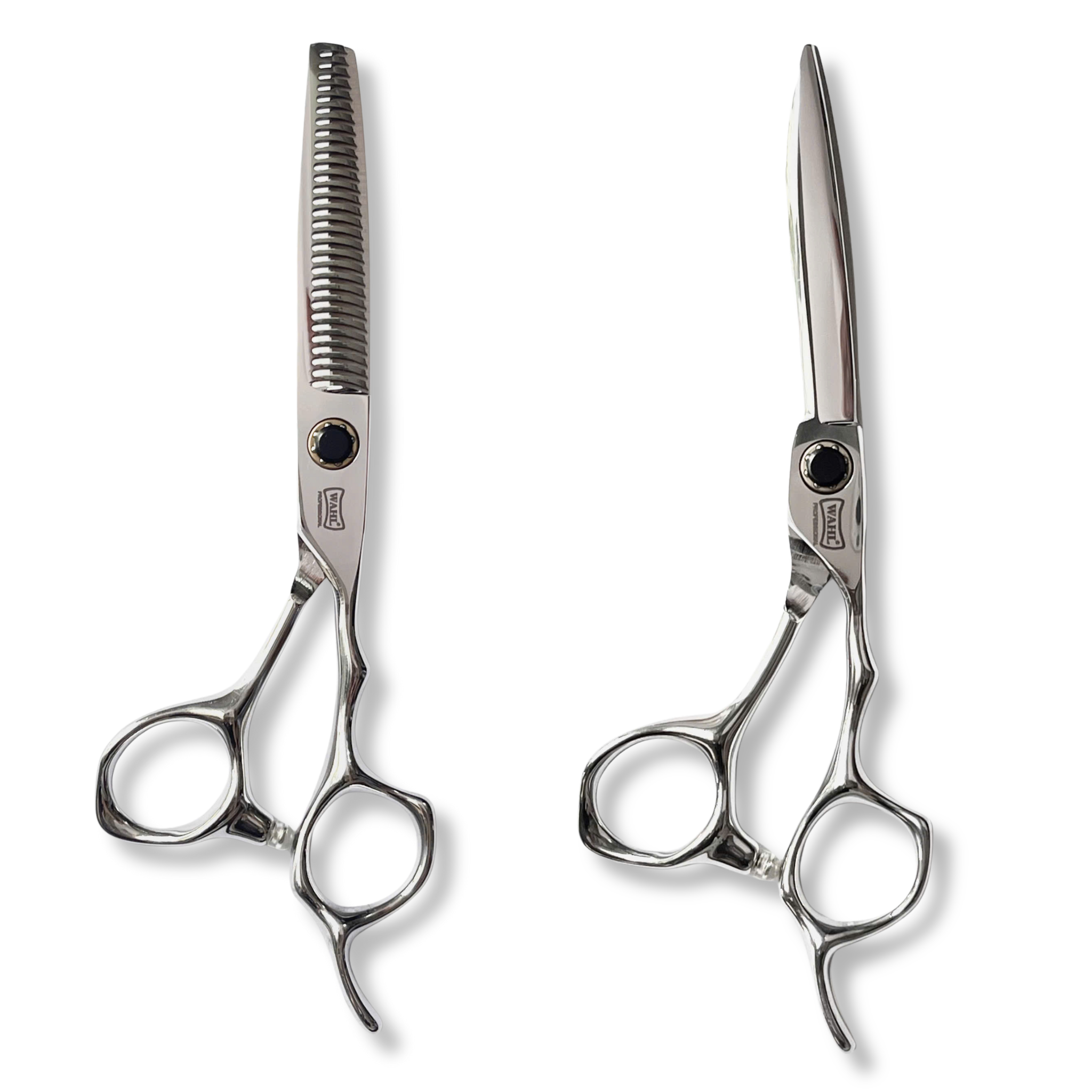 - Bộ sản phẩm: Thường được bán theo bộ bao gồm một kéo cắt và một kéo tỉa. Kéo tỉa thường có tỷ lệ tỉa thưa khoảng 10-15%, phù hợp để làm mỏng tóc tự nhiên.