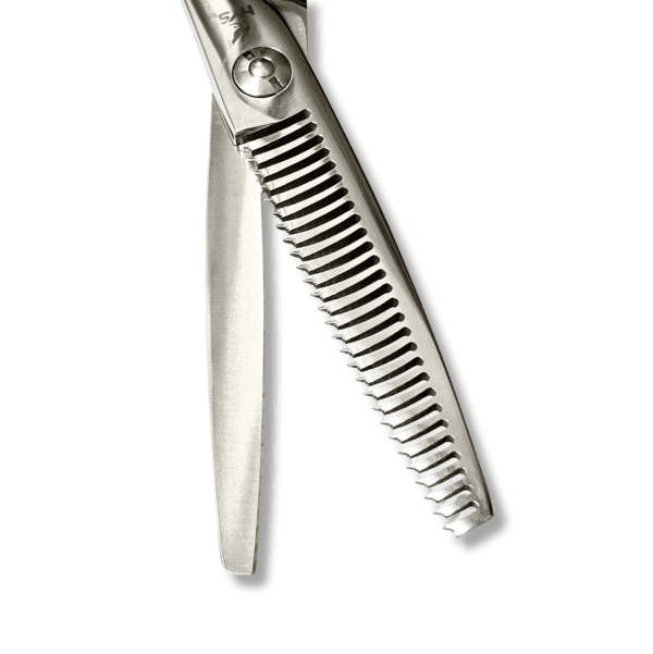 - Kiểu răng cưa: Kéo tỉa này có một bên lưỡi là răng cưa, bên còn lại là lưỡi cắt phẳng. Thiết kế 28 răng giúp tỉ lệ tỉa tóc vừa phải, tạo sự chuyển tiếp mượt mà cho mái tóc.