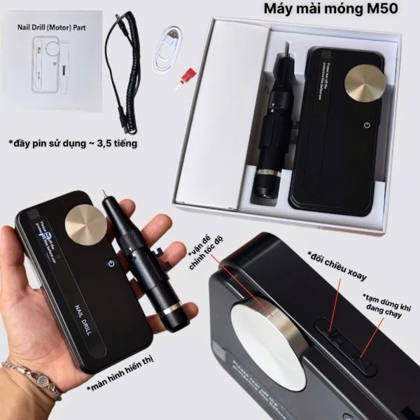 Máy mài móng M50 là thiết bị tích điện chuyên dụng cho ngành làm móng, được thiết kế nhỏ gọn, cầm tay và sở hữu nhiều tính năng nổi bật hỗ trợ tối đa cho thợ nail.