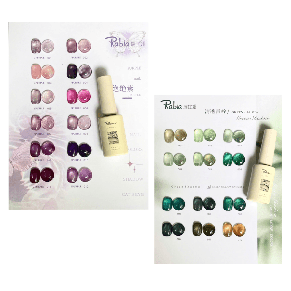 Set Sơn Mắt Mèo Bảng 12 Màu Tone Tím , Xanh Rabia Yanzhi : Cả hai set sơn này đều có dung tích 15ml mỗi chai và đi kèm với bảng màu