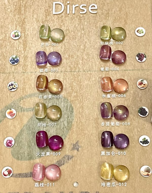 Set Sơn Mắt Mèo Màu Trái Cây Bảng 12 Màu Drise : Bộ sưu tập sơn gel Dirse mang đến một làn gió mới cho nghệ thuật làm móng, lấy cảm hứng từ những sắc màu tươi mát của các loại trái cây nhiệt đới. Mỗi màu trong bộ đều có độ bóng trong suốt nhẹ, pha lẫn ánh nhũ cat’s eye lấp lánh, giúp đôi tay trở nên nổi bật, tươi trẻ