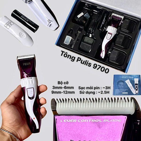 Tông Đơ Cắt Pulis 9700 Lưỡi Sứ : Tông đơ cắt tóc Pulis 9700 là một thiết bị chăm sóc tóc không dây cao cấp, được thiết kế cho cả nhu cầu sử dụng tại nhà và chuyên nghiệp tại salon. Sản phẩm nổi bật với hiệu suất mạnh mẽ và thiết kế tiện dụng, đi kèm bộ phụ kiện đầy đủ giúp người dùng dễ dàng tạo kiểu tóc.
