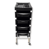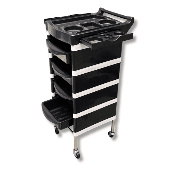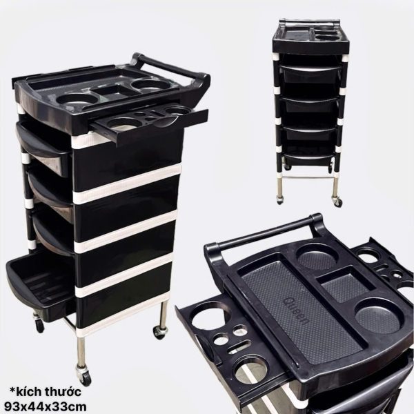 - Mặt trên có nhiều ngăn/khay đựng chuyên biệt để các dụng cụ như chén pha hóa chất, lược, cọ, kéo, v.v..